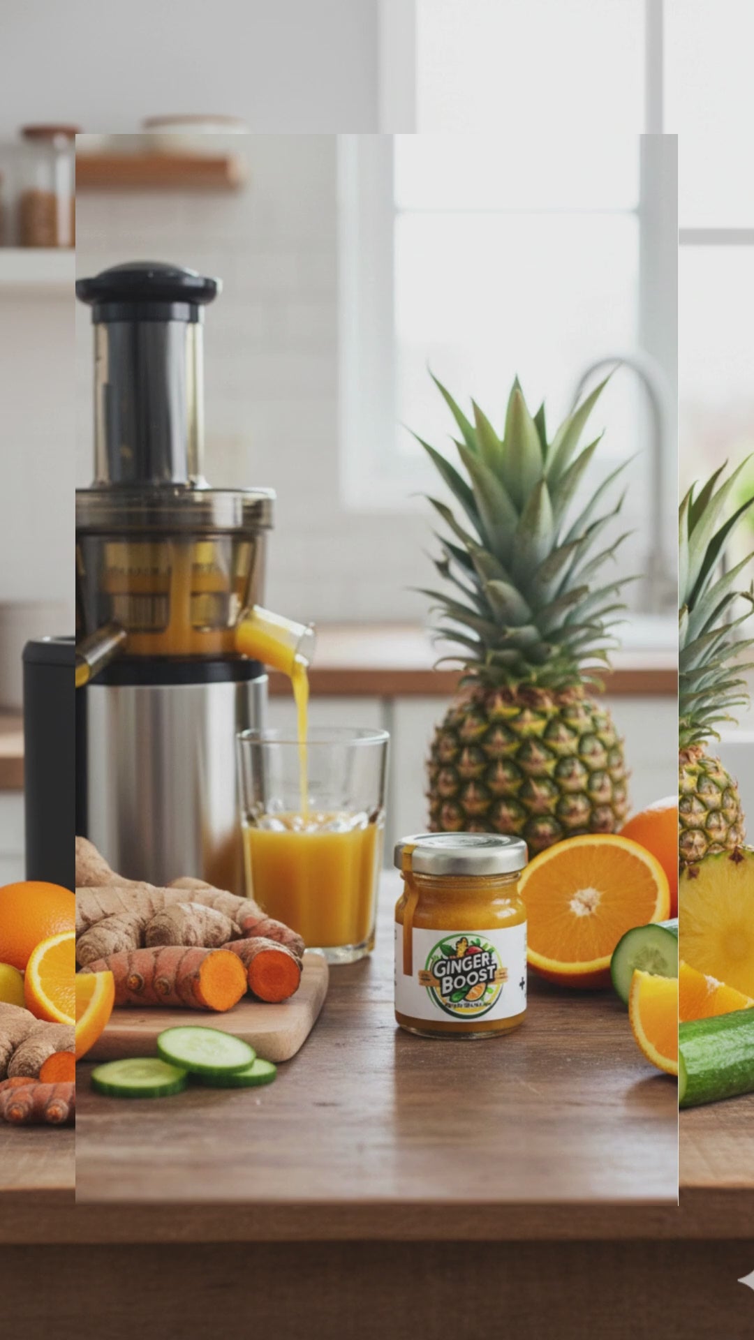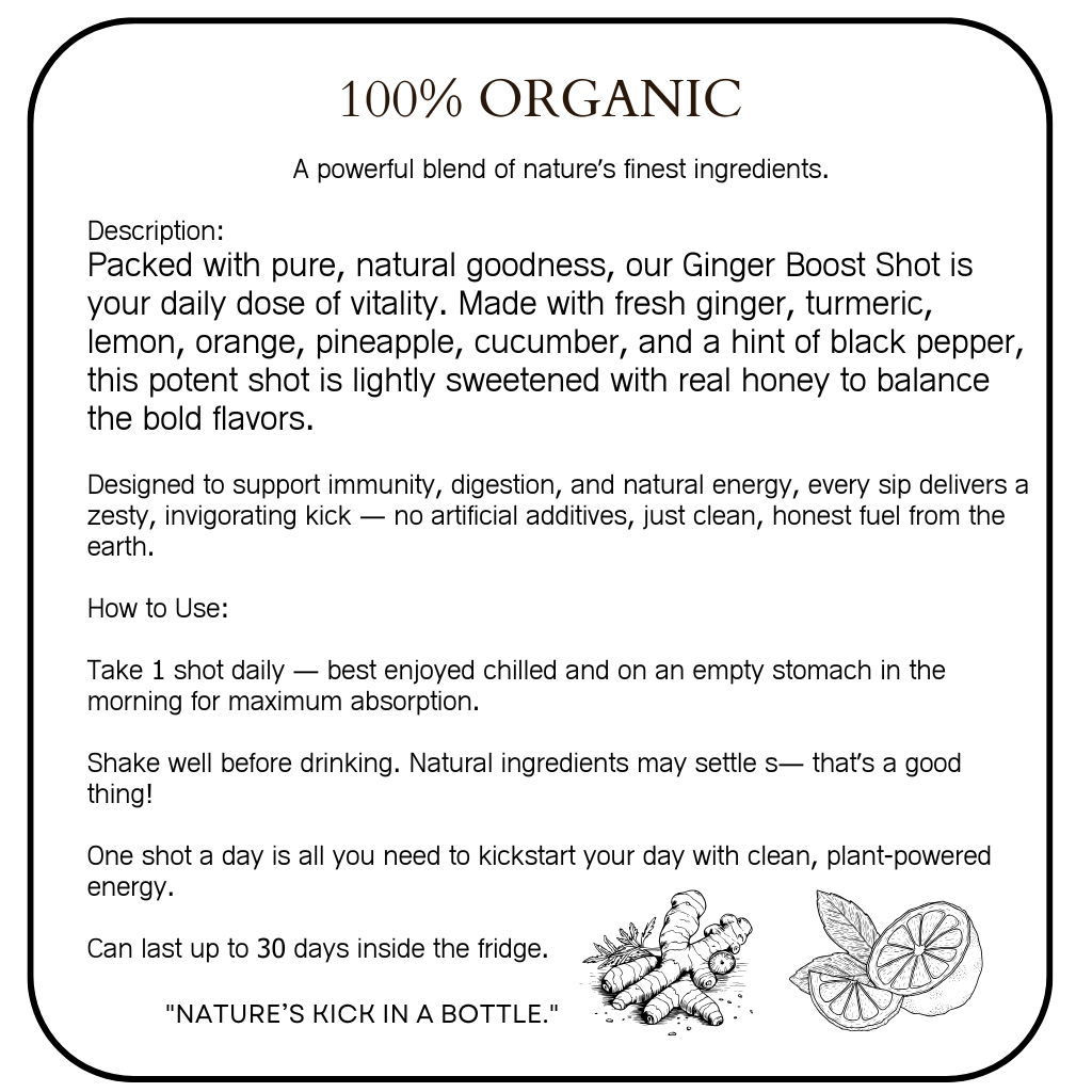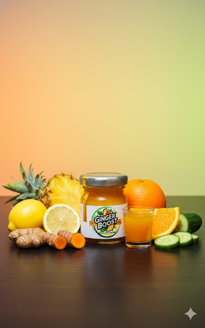 GingerBoost is a concentrated 40ml ginger shot crafted from fresh ginger, turmeric, lemon, orange, pineapple, cucumber, and a subtle hint of black pepper. This potent blend supports immunity, enhances digestion, and provides a natural energy boost. Designed for daily morning use, just one shot delivers a powerful nutrient-packed start to your day